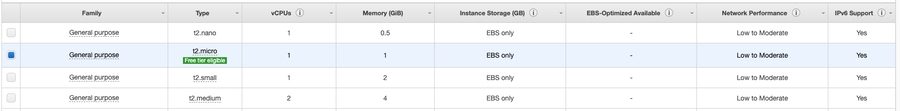 This will bring you to a screen that contains all of the available instance types within AWS EC2. Any machine that qualifies for AWS' free tier will be sufficient.