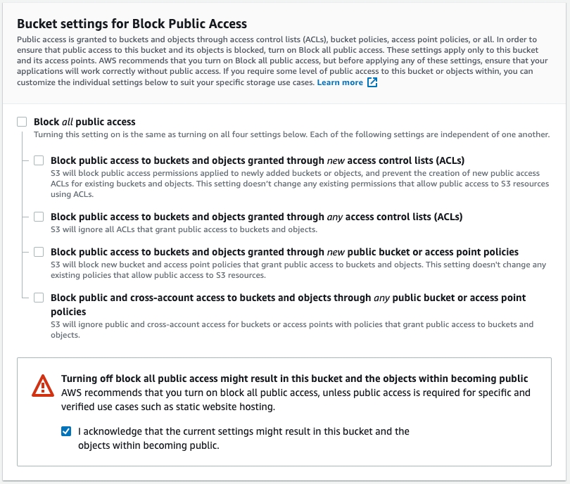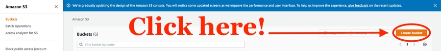 To start, navigate to AWS S3 from within the AWS Management Console. Click Create bucket in the top right: