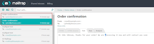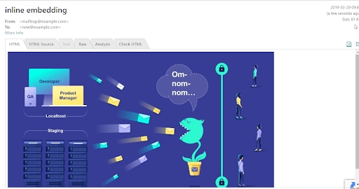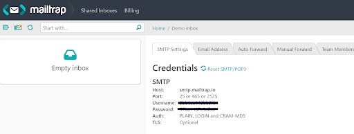 Fake SMTP server imitates the work of a real 3rd party web server. In further examples in this post, we will use Mailtrap. Beyond testing email sending, it will let us check how the email will be rendered and displayed, review the message raw data as well as will provide us with a spam report. Mailtrap is very easy to set up: you will need just copy the credentials generated by the app and paste them into your code.