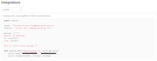 Mailtrap makes things even easier. Go to the Integrations section in the SMTP settings tab and get the ready-to-use template of the simple message, with your Mailtrap credentials in it. It is the most basic option of instructing your Python script on who sends what to who is the sendmail()