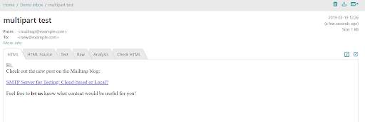 # write the plain text part text = """\ Hi, Check out the new post on the Mailtrap blog: SMTP Server for Testing: Cloud-based or Local? https://blog.mailtrap.io/2018/09/27/cloud-or-local-smtp-server/ Feel free to let us know what content would be useful for you!"""