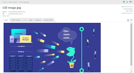 The CID image is shown both as a part of the HTML message and as an attachment. Messages with this image type are often considered spam: check the Analytics tab in Mailtrap to see the spam rate and recommendations on its improvement. Many email clients - Gmail in particular - don’t display CID images in most cases. So let’s review how to embed a base64 encoded image.