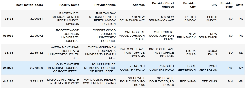The first item has a match score of 3.09 and certainly looks like a clean match. You can see that the Facility Name and Provider Name for the Mayo Clinic in Red Wing has a slight difference but we were still able to get a good match.