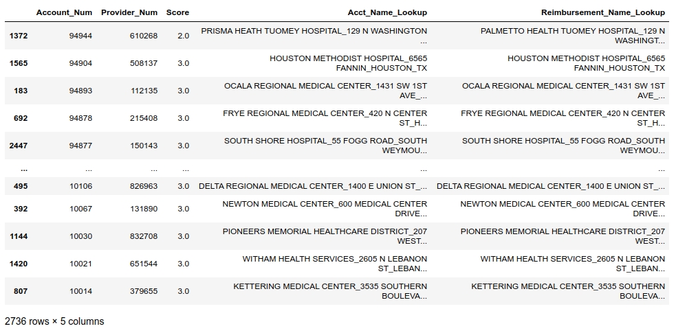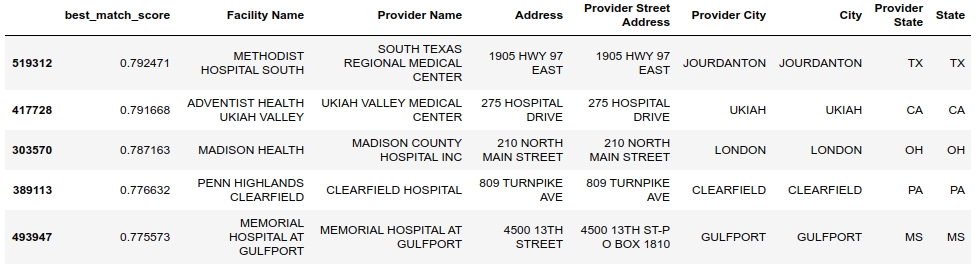 This example shows how some of the matches get a little more ambiguous. For example, is ADVENTIST HEALTH UKIAH VALLEY the same as UKIAH VALLEY MEDICAL CENTER? Depending on your data set and your needs, you will need to find the right balance of automated and manual match review.