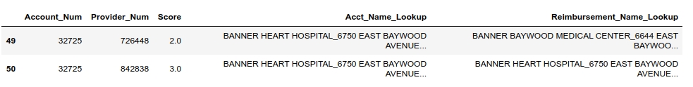 One of the differences between the toolkit approach and fuzzymatcher is that we are including multiple matches. For instance, account number 32725 could match two providers: