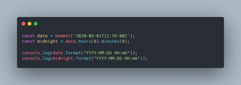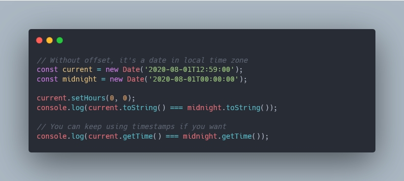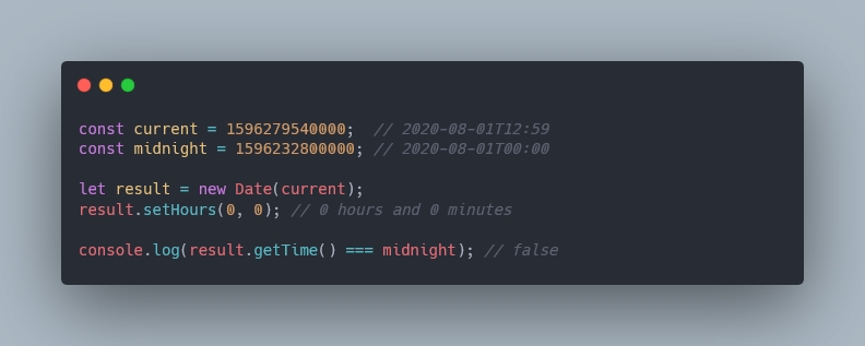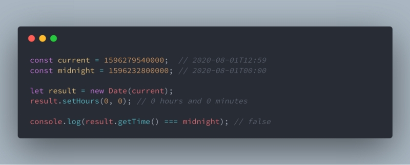 sets the date’s hours and minutes to zero (midnight). I first choose a random timestamp which isn’t at midnight. Then compare the result with the timestamp for the same day at midnight.