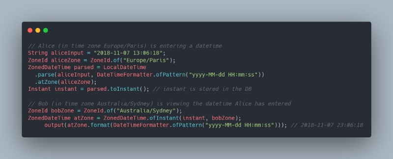 Remember Rule #1 about timestamps? You should only use a UTC timestamp for saving. The Java API provides an Instant