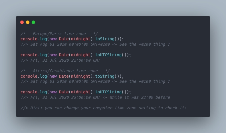 I recently came across an issue involving timezones. There were some unit tests making assertions about dates that used to work at my office in France but weren't working in Morocco for new members on our team.Here is the unit test working in France but not in Morocco